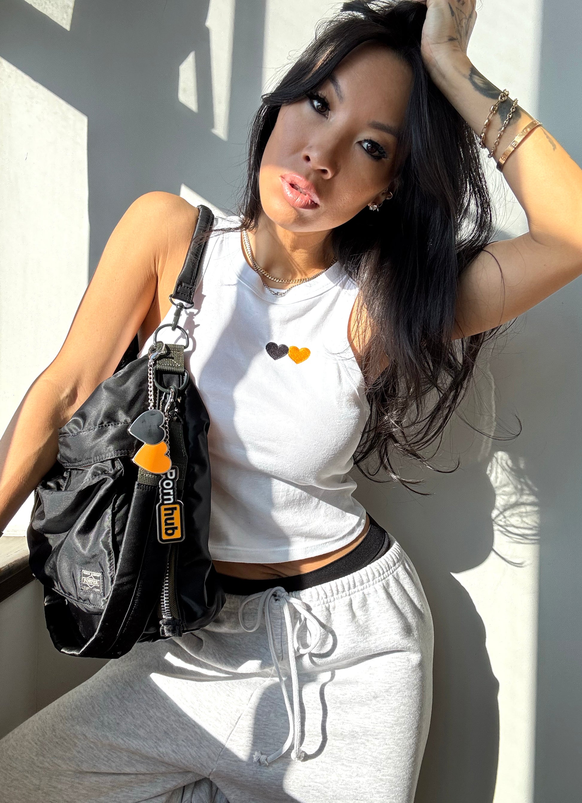Subtly coded. If you know, you know. The double hearts ribbed tank features the black and orange embroidered hearts on the front chest and a subtle Pornhub logo on the back neck.
